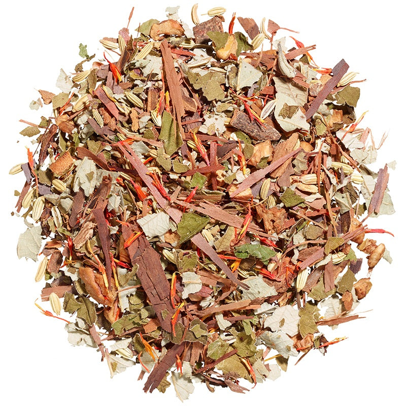 Zutaten: Apfelstückchen, Fenchel, Brombeerblätter, Zimtstückchen, Lapacho, Sternanis, Aromen, Färberdisteln